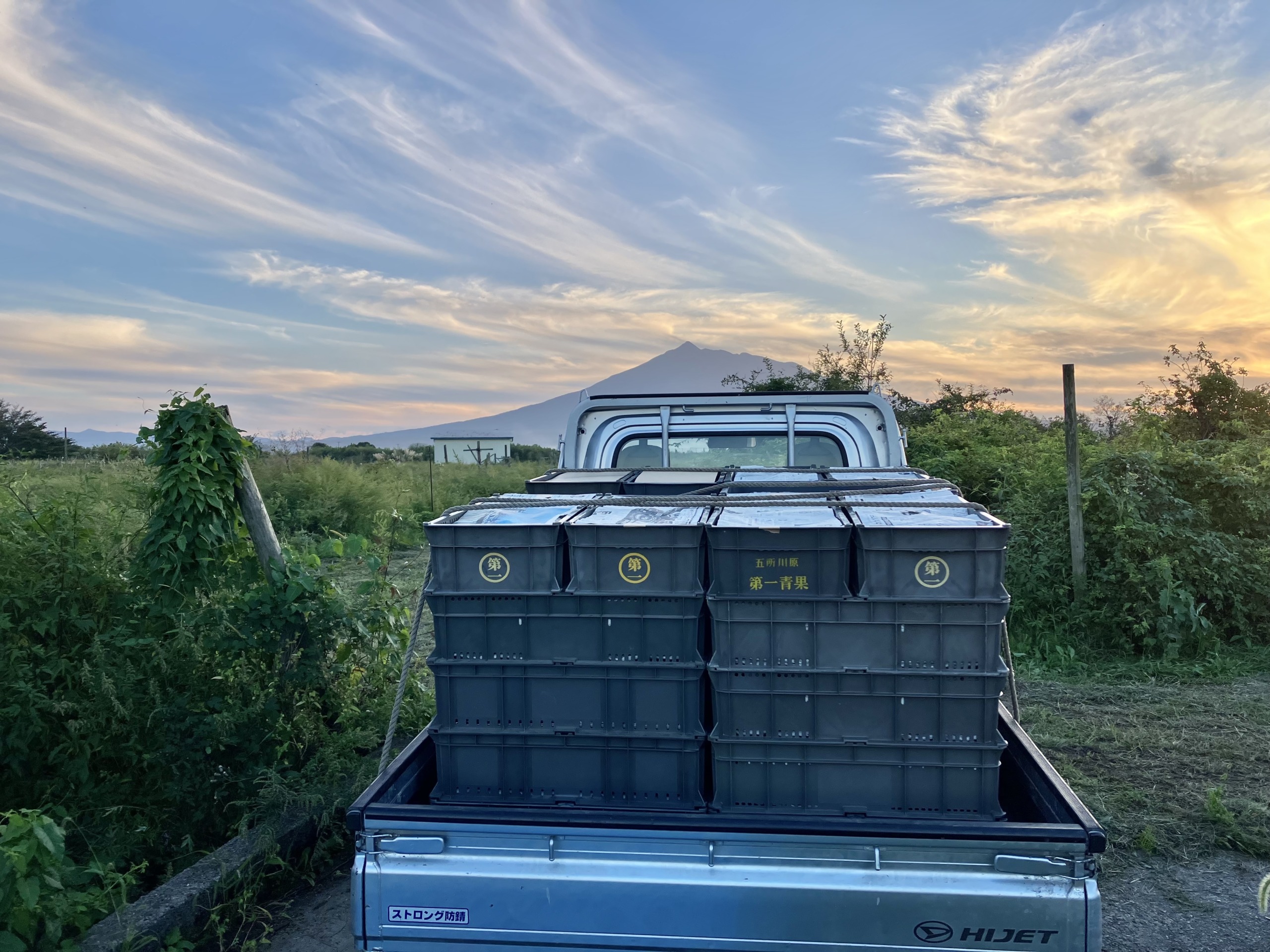 🌄 写真は、収穫したスチューベンを積んだ軽トラックと、夕焼けに染まる岩木山。